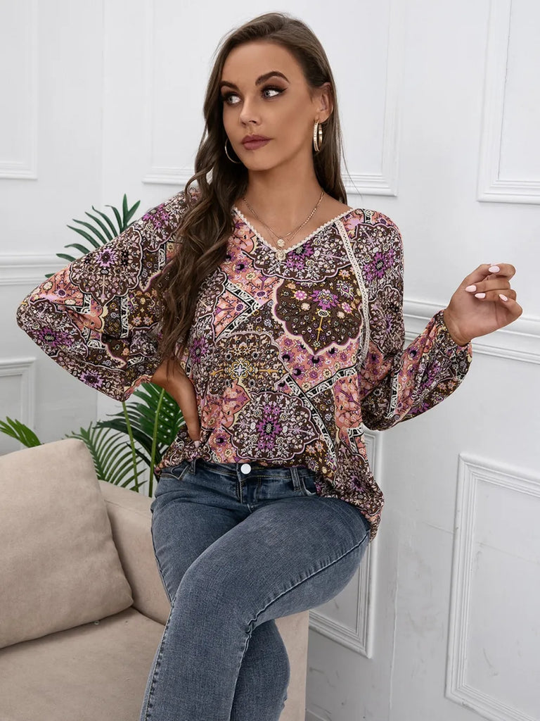 Ivy Lane Lace Detail Printed V-Neck Blouse