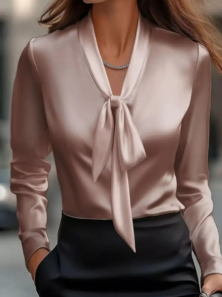 Satin Bow Tie Front Long Sleeve Blouse- 4 Colors