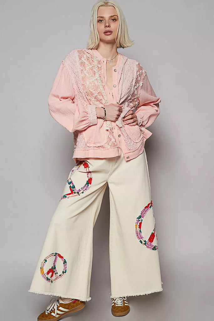 POL Exposed Seam Button Down Hooded Jacket with Lace Detail