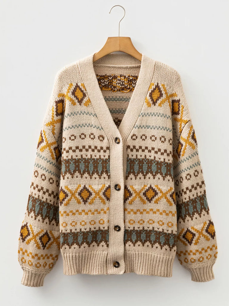 Western Pattern Knitted Button V Neck Cardigan Sweater