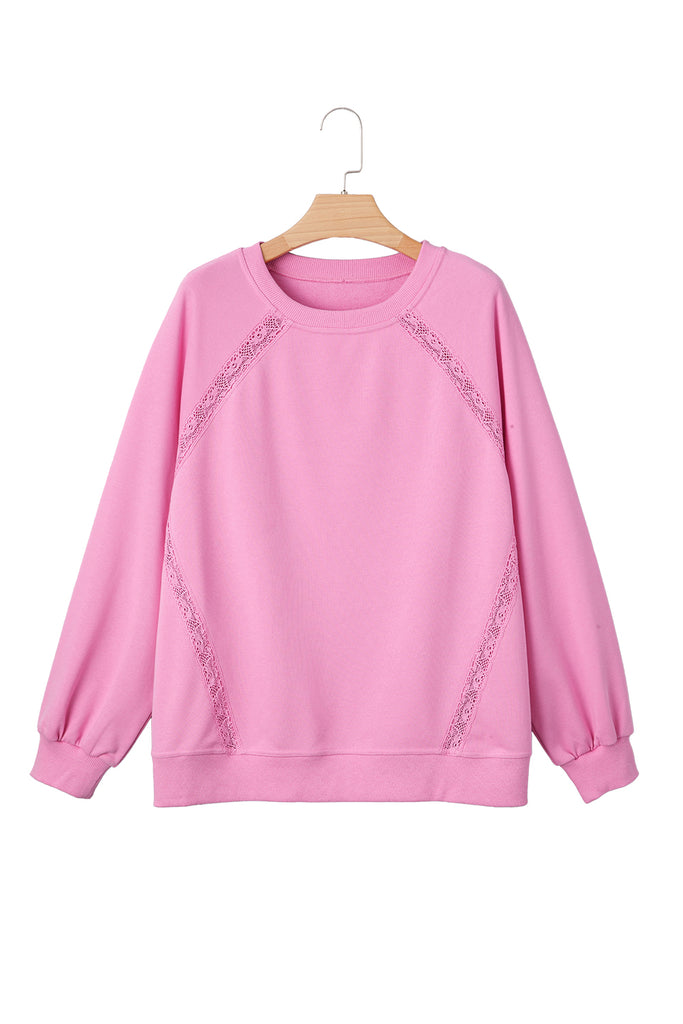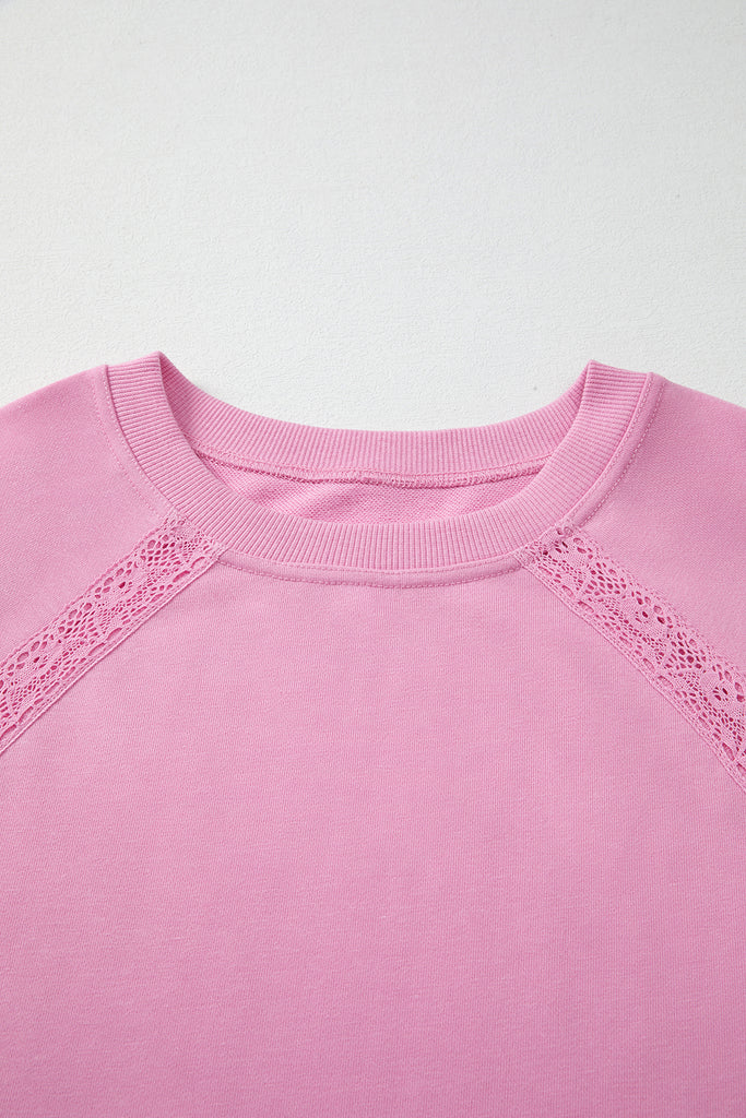 Bright Pink Lace Patchwork Raglan Sleeve Loose Fit Sweatshirt