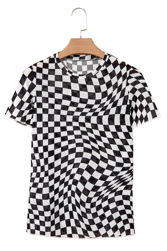 Black Checker Mesh Crew Neck T Shirt