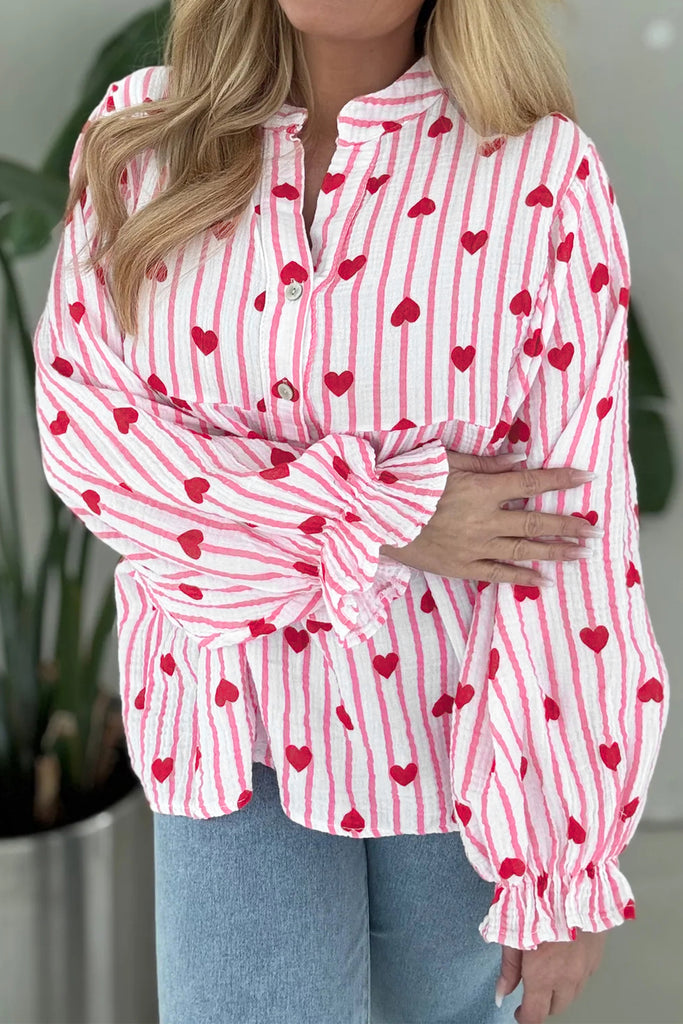 Pink StripedTextured Heart Print Long Flounce Sleeve Blouse