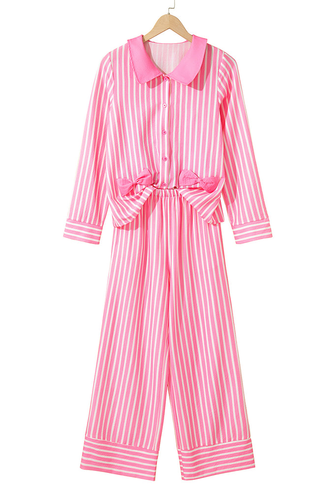 Pink Striped Bow Decor Peter Pan Collar Button-Up Top and Pants Pajama Set