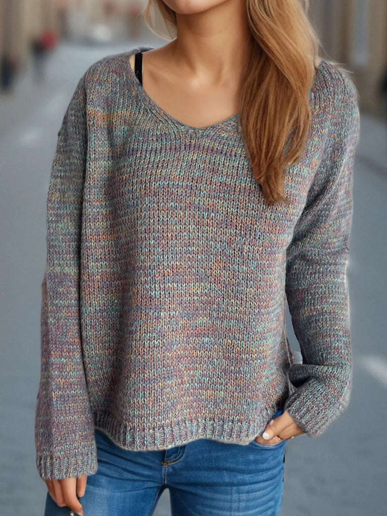 One Size Heathered V-Neck Long Sleeve Sweater- 2 Colors