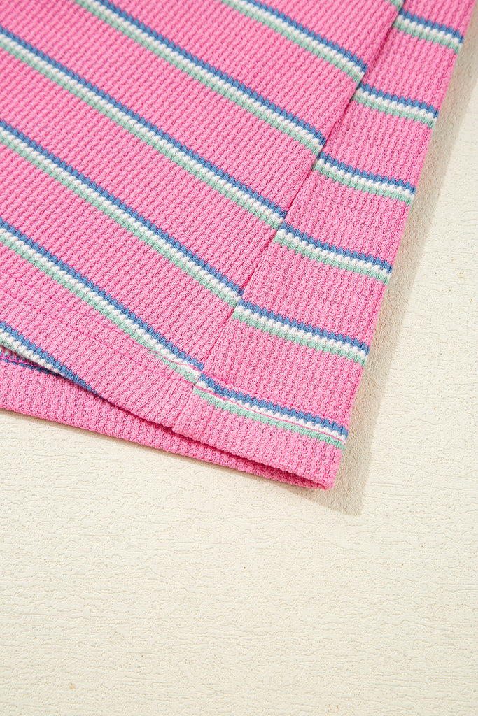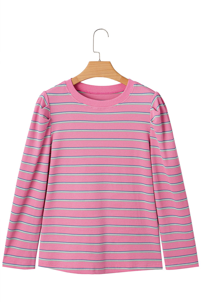 Pink Striped Textured Knit Puff Sleeve Crew Neck Top