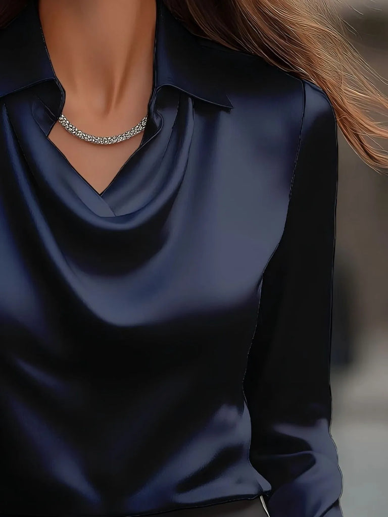 Satin Ruched Long Sleeve Drape Collar Blouse A- 6 Colors