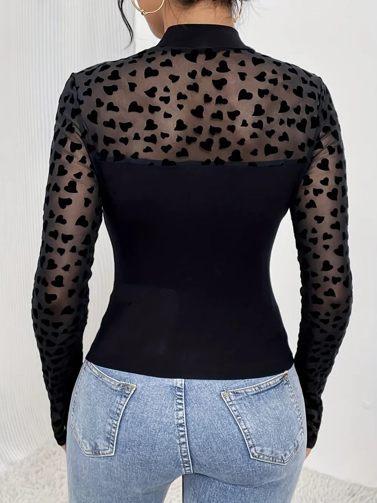 Flocked Hearts Mock Neck Long Sleeve Blouse- 4 Colors