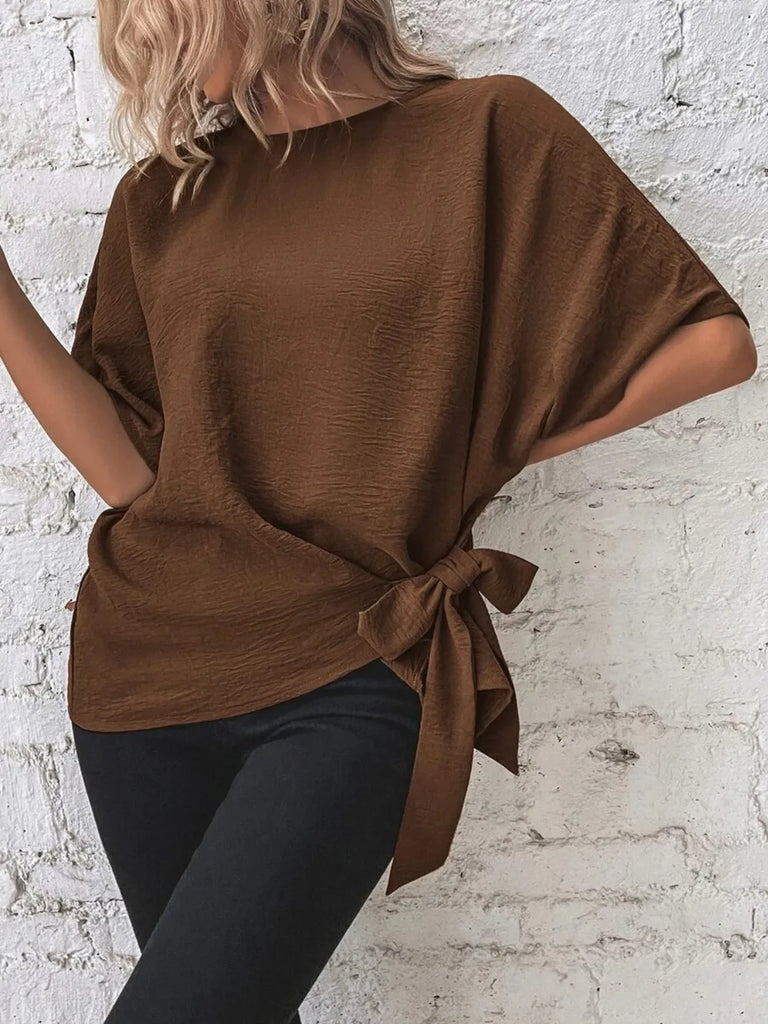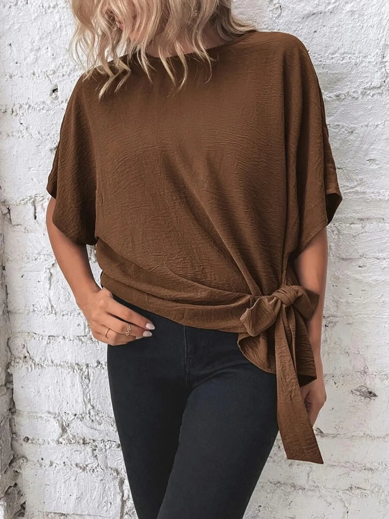 Knotted Crew Neck Short Sleeve Blouse- 5 Colors
