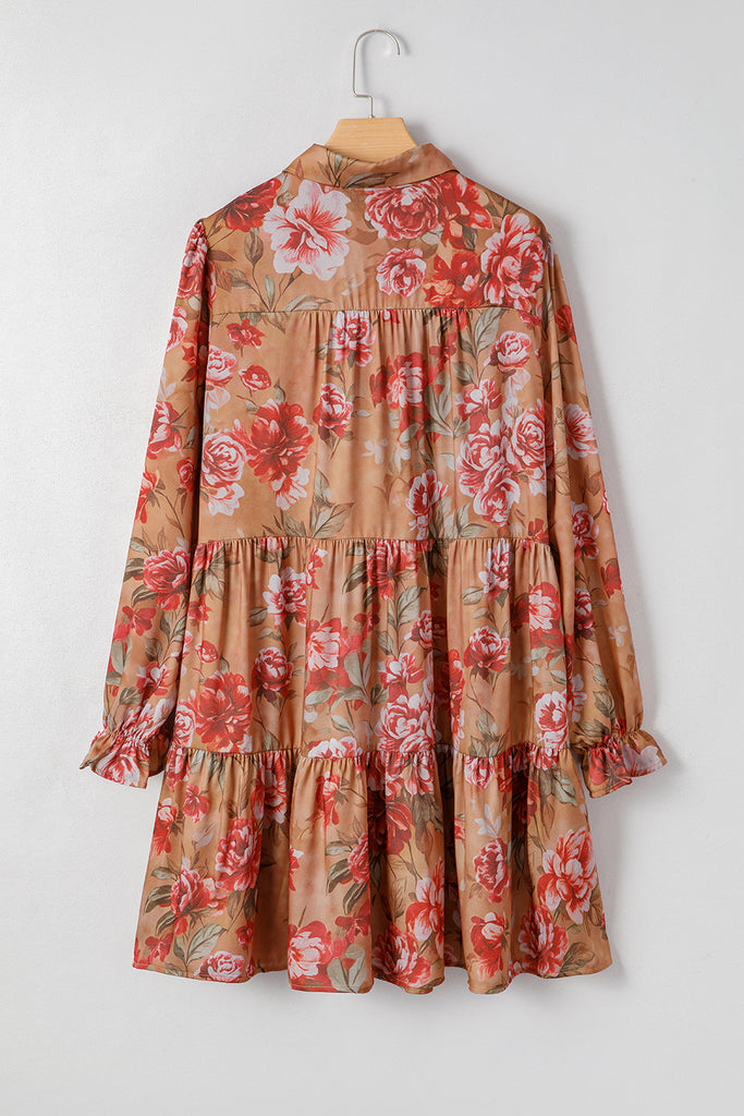 Brown Floral Print Shirt Style Long Sleeve Ruffle Mini Dress