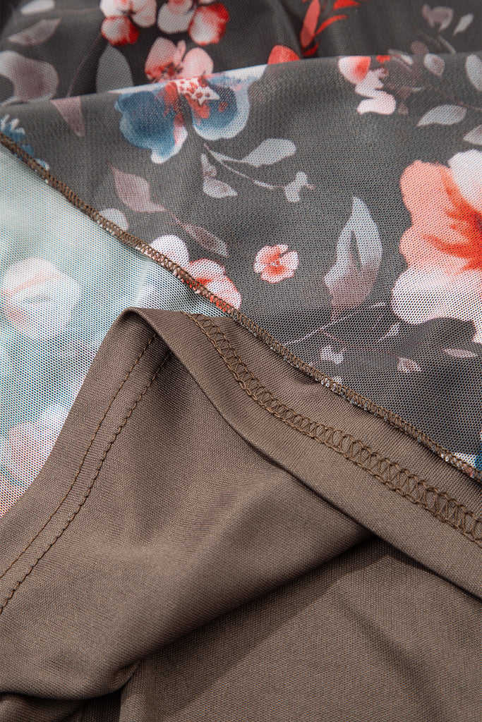 Brown Frilly Smocked Bodice Floral Mesh Long Sleeve Mini Dress