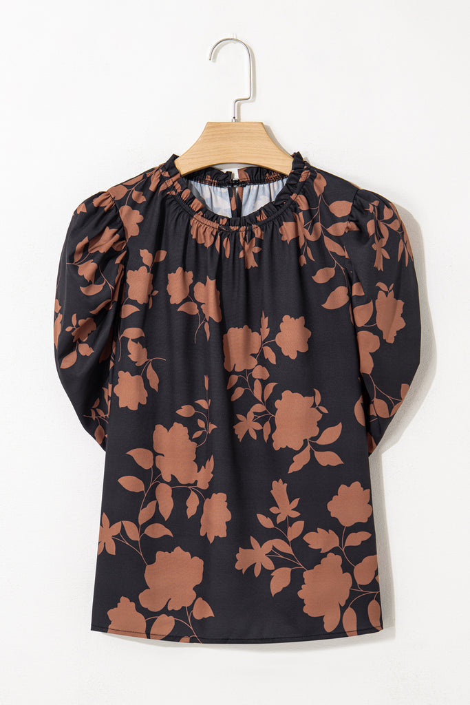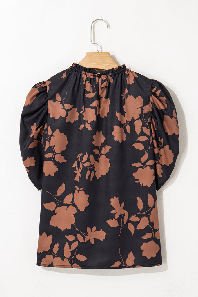 Chestnut Floral Print Frill Neck Bubble Sleeve Blouse