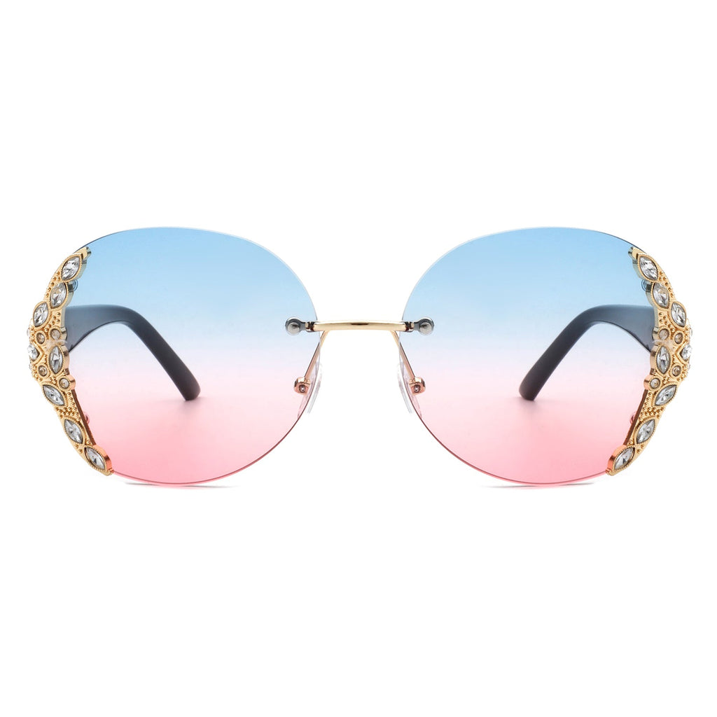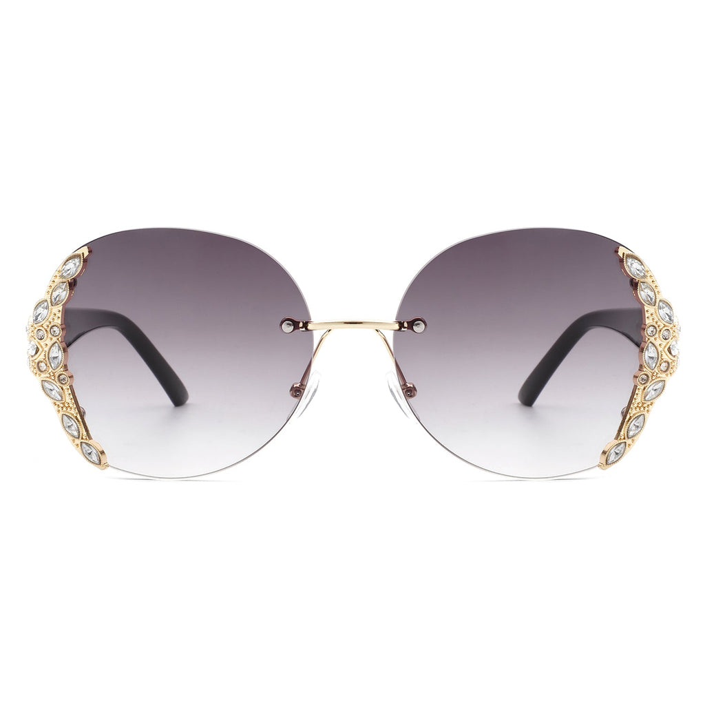 Jadeisle - Women Oval Rimless Rhinestone Design Round Oversize Sunglasses