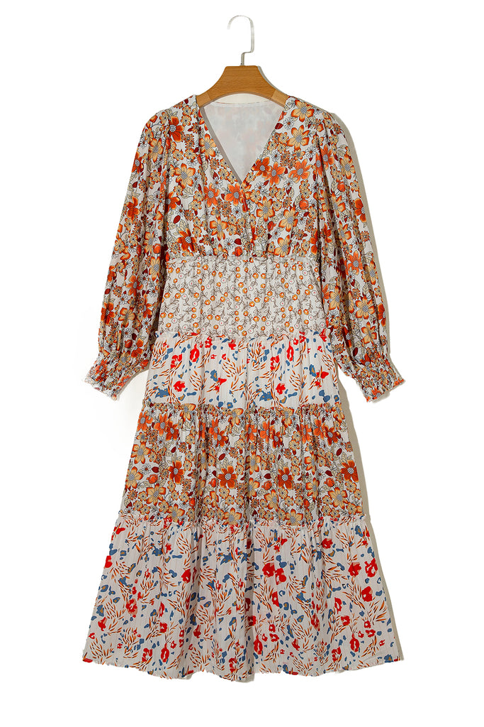 Khaki Floral Print Ruffled Tiered Long Sleeve V Neck Midi Dress