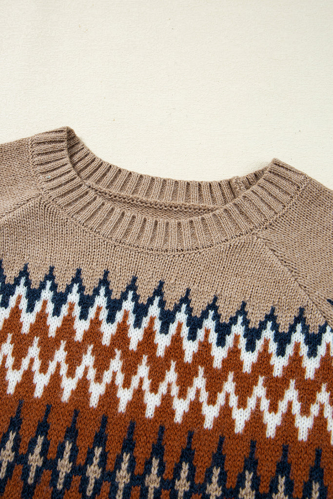 Khaki Geometric Print Colorblock Crew Neck Sweater