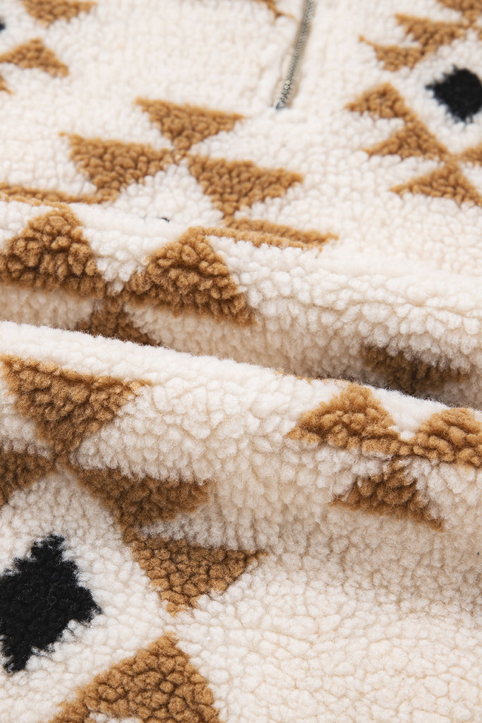 Khaki Geometric Print Sherpa Quarter Zip Collar Sweatshirt