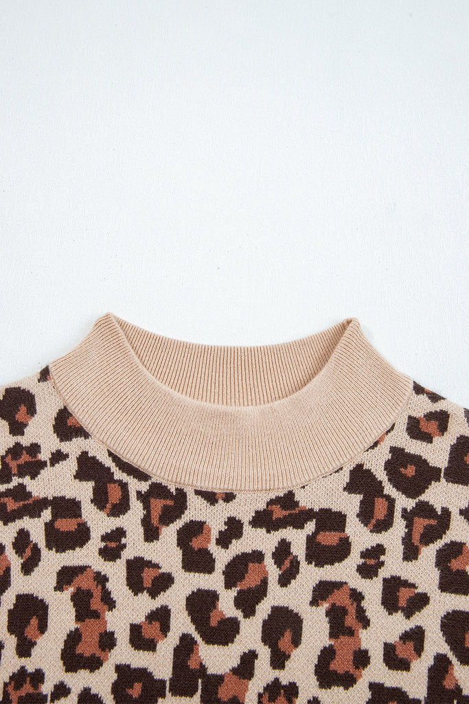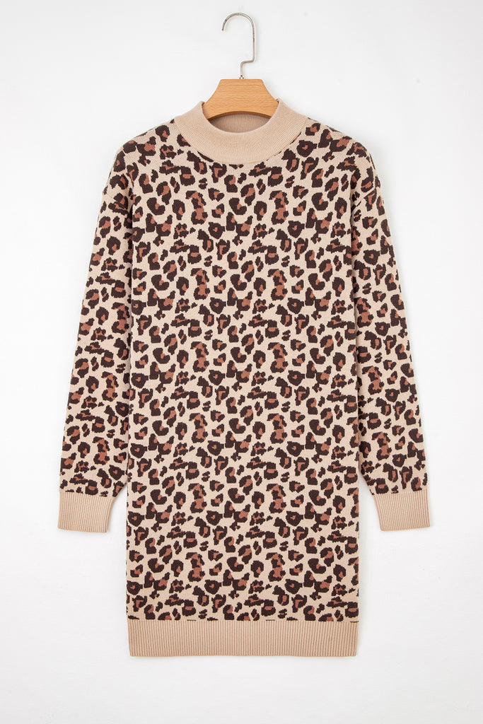 Khaki Leopard Print High Neck Shift Mini Sweater Dress