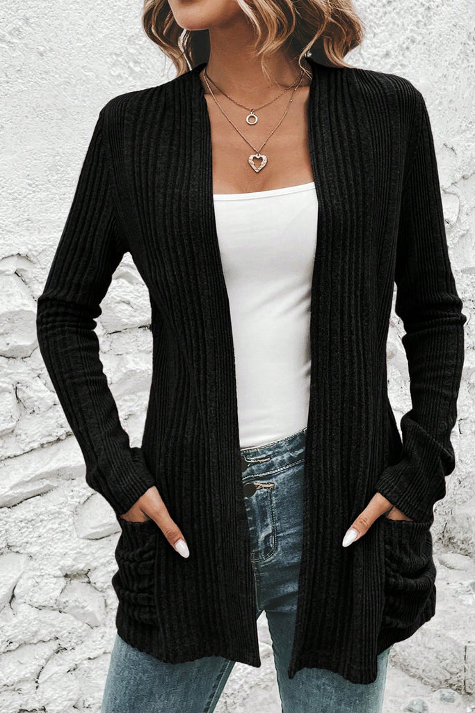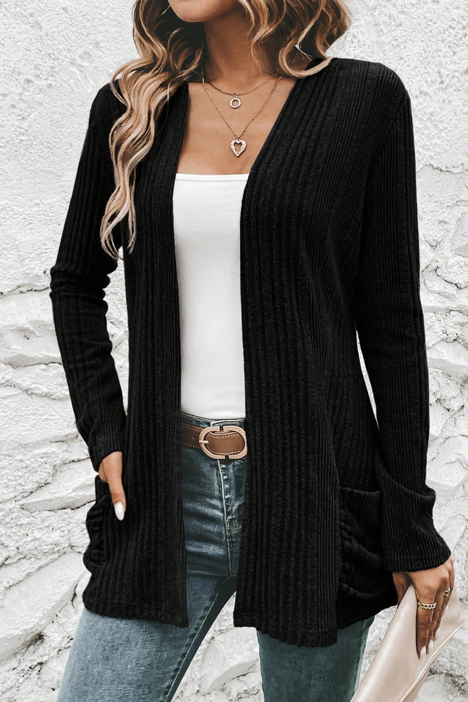 Stone Blue Ribbed Open Front Knitted Top with Pockets